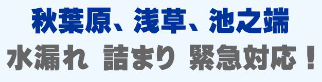 秋葉原、浅草、池之端での水の困った即解決!急な水道トラブルに緊急でかけつけ訪問し、蛇口の水漏れ、トイレ詰まり、排水の溢れ、タンクの故障など修理いたします。